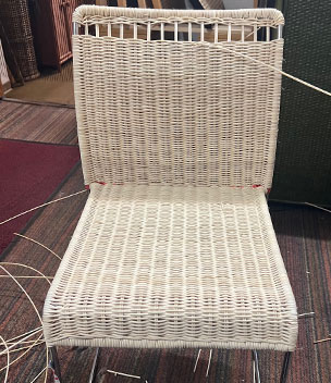 Bilder oben: Die Restaurierung eines Geflechtes an einem italienischen Design-Klassikers. Peddigrohr-Stahl-Stuhl